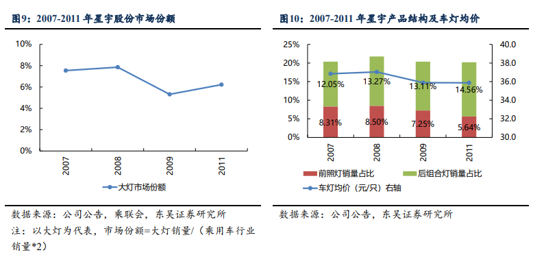 公司市场份额2007-2011年基本保持稳定。以价值量和技术含量较高的大灯为例,公司2007-2008年的市占率基本在7.5%-8%之间,至2011年小幅下滑至6.22%,整体基本保持稳定。