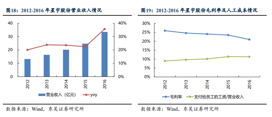 2012-2016年公司毛利率整体处于承压状态。公司毛利率从2012年的25.93%下降至2016年的20.98%,主要系:1、下游客户的产品降价;2、人工及原材料成本上涨(员工工资占收入比例从2011年的7.92%提升至2016年的11.32%);3、公司战略开拓新客户。