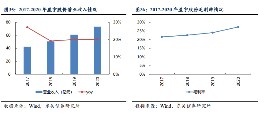 2017-2020年公司营业收入实现稳定增长。公司营收从2016年的33.47亿元持续增长至2020年的73.23亿元,4年复合增速为21.62%,星宇在这一阶段的收入增速显著超越了下游乘用车行业的增速。