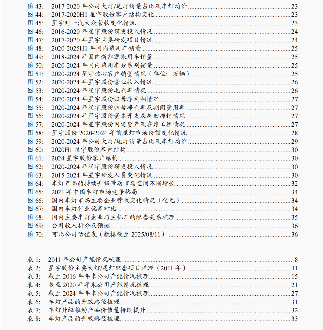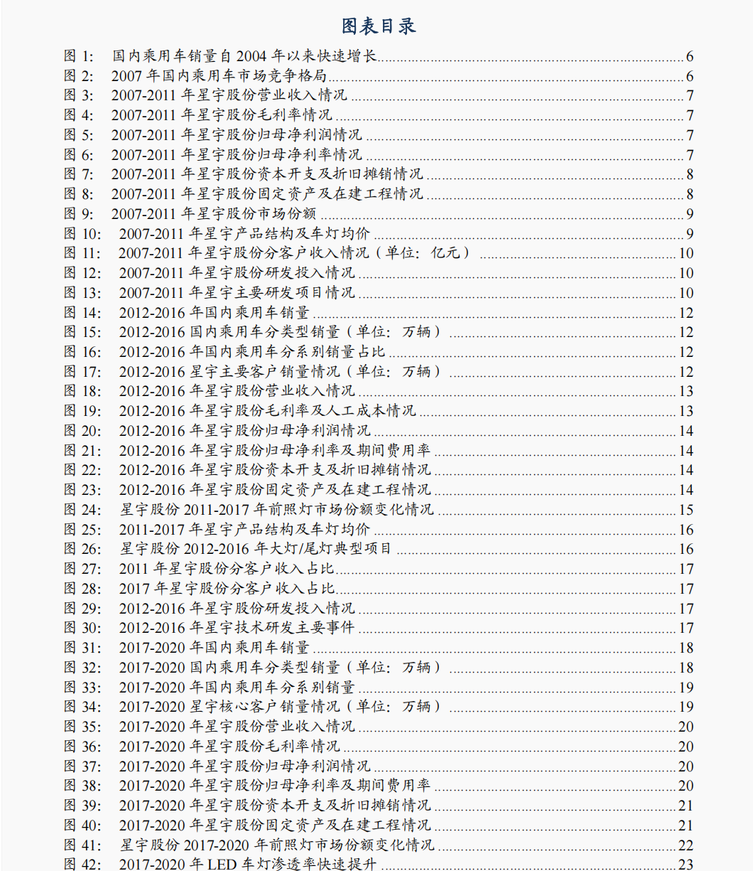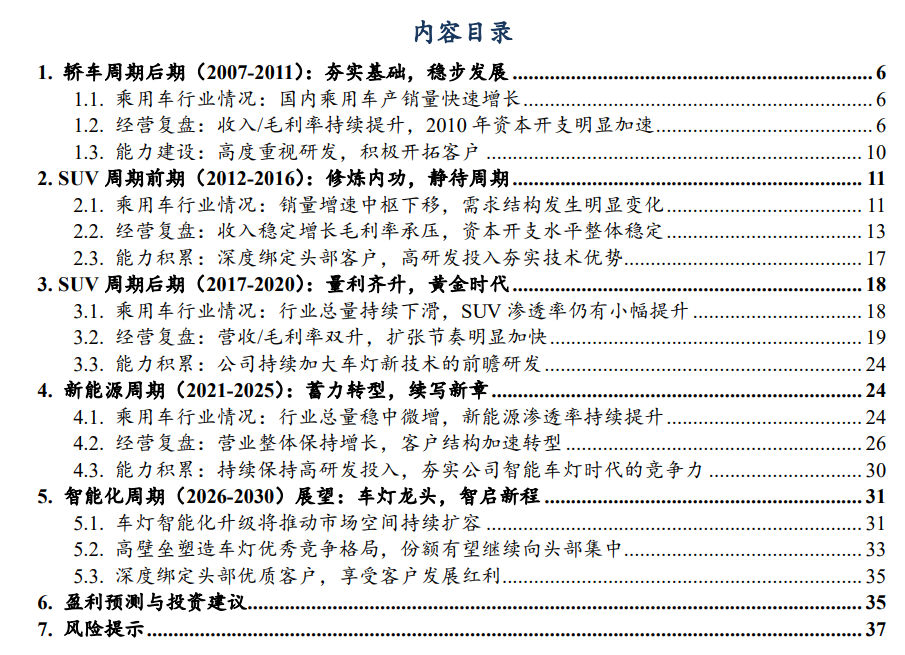 星宇自上市以来在营收端和利润端表现出了优秀的成长性,公司沿着“客户拓展+产品升级”的路径快速发展,实现了优质客户的不断拓展和产品结构的持续升级,目前已经成长为自主车灯龙头企业。在本篇报告中,我们对星宇自2007年以来的每一个发展周期进行了复盘,梳理了公司每一轮成长周期中的下游变化、经营成果、扩张节奏、产品变化、驱动客户以及能力积累等,并对星宇未来的发展情况进行了展望。