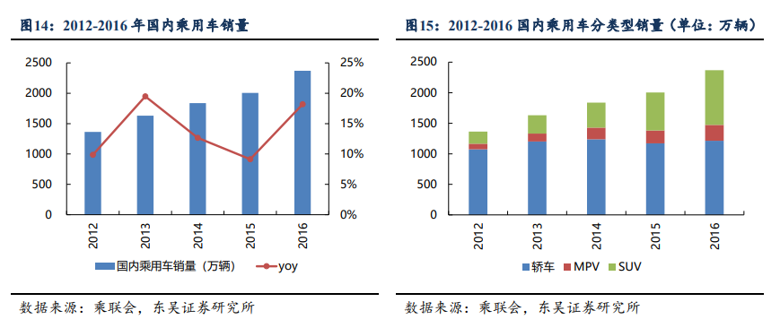 2012-2016年乘用车销量复合增速回落。国内乘用车行业销量从2012年的1364.35万辆增长至2016年的2369.34万辆,4年复合增长率为14.80%,这一阶段国内乘用车行业总量增速相比2003-2011年有所下滑。