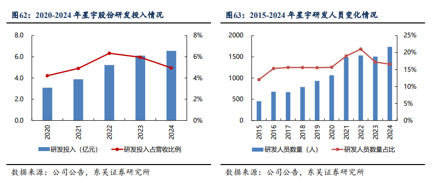 公司2020-2024年进一步加大研发投入。公司研发投入金额从2020年的3.09亿元持续增长至2024年的6.55亿元,对应的研发投入占收入比例在2021-2024年基本维持在5%及以上,其中2022年研发投入占收入比例高达6.33%。研发人员数量方面,公司研发人员数量从2020年的1065人增长至2024年的1734人,研发人员数量占比也基本在16%以上。