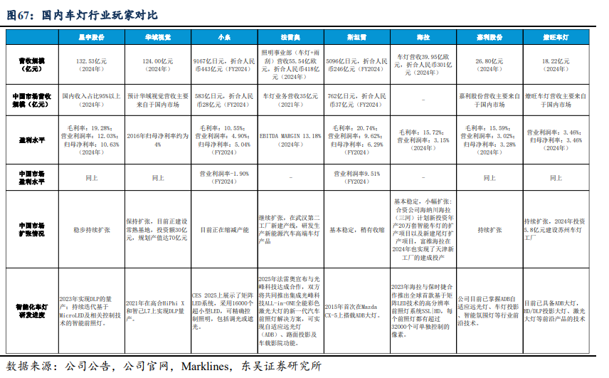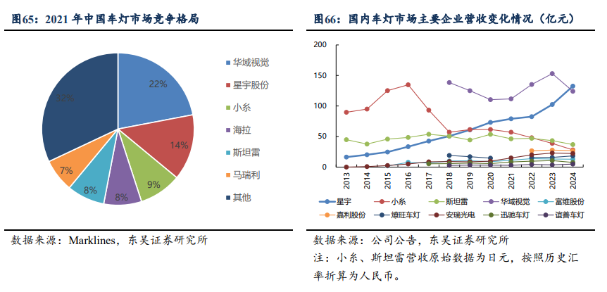 2018年华域收购上海小糸并更名华域视觉,成为国内车灯市场龙头,彼时市场呈现“一超多强”的格局。2020-2024年星宇收入持续增长,2020年超越小糸中国区,2024年赶超华域视觉,国内车灯行业逐步呈现出“双龙头”的新格局。