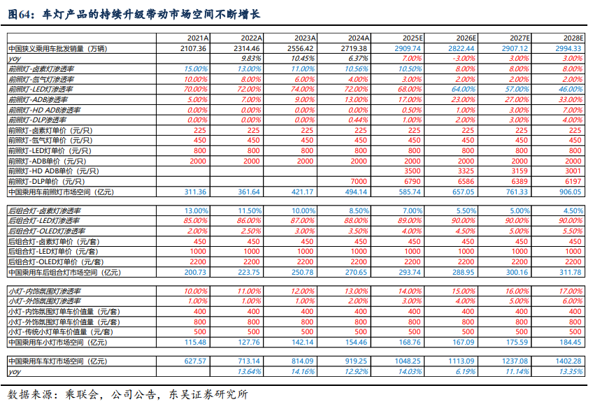 我们对国内乘用车车灯市场的行业空间进行了测算,国内乘用车车灯市场规模将从2024年的919亿元持续增长至2028年的1402亿元。