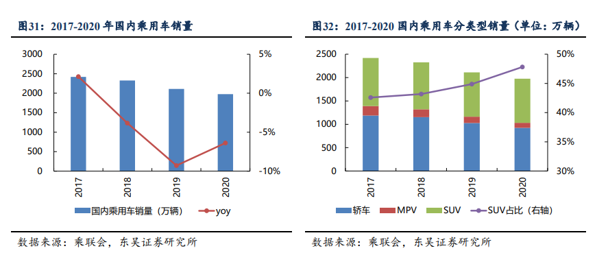 2017-2020年国内乘用车行业销量持续下滑。国内乘用车行业销量从2017年的2419.75万辆下降至2020年的1975.96万辆,3年复合增长率为-6.53%,国内乘用车行业总量在SUV周期后期出现持续下降主要系:1、小排量乘用车购置税优惠政策2017年年末结束,因此2018年需求被部分透支;2、2018年中美贸易摩擦对国内宏观经济造成一定影响,乘用车作为可选消费也遭受到一定冲击;3、2020H1国内突发的公共卫生事件对人员流动产生一定影响。