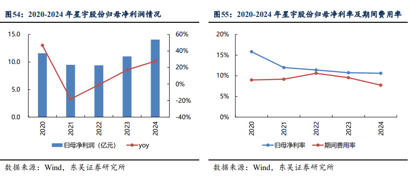 2021年公司归母净利率同比降幅较大,2022-2024年盈利能力整体维持稳定。星宇2021年归母净利率为12.00%,同比下降3.84个百分点,主要系公司同期毛利率同比下降+管理/研发费用率同比微增所致。2022-2024年公司归母净利率基本稳定在10.5%-11.5%的区间。