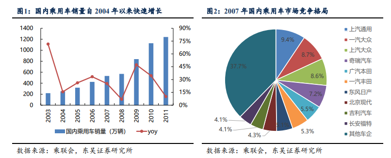 彼时(2007年)合资占据国内车市主要份额,其中以德系和日系为主。从行业竞争格局来看,南北大众市占率位居行业第二和第三,合计份额为17.3%;日系的广本、一丰、东风日产合计份额约16%。
