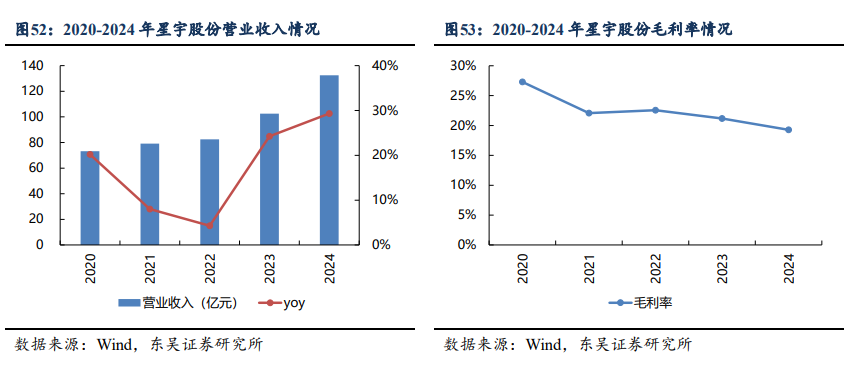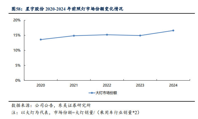 星宇前照灯市占率继续稳步提升。以前照灯为代表,星宇的市场份额从2020年的13.59%快速提升至2024年的16.60%。
