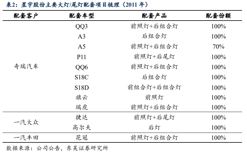 针对已经建立配套关系的客户,公司重点工作目标集中在加大合作的广度和深度。公司通过分析客户的战略定位,了解客户新车型推出计划,尽早介入客户的新车型开发,将合作配套的产品从普通小灯扩展至高附加的前后灯产品。(彼时公司在奇瑞中的大灯配套较多,而在一汽大众和一汽丰田中仍以小灯配套为主,在一汽大众仅配套捷达大灯,一汽丰田仅配套花冠大灯)