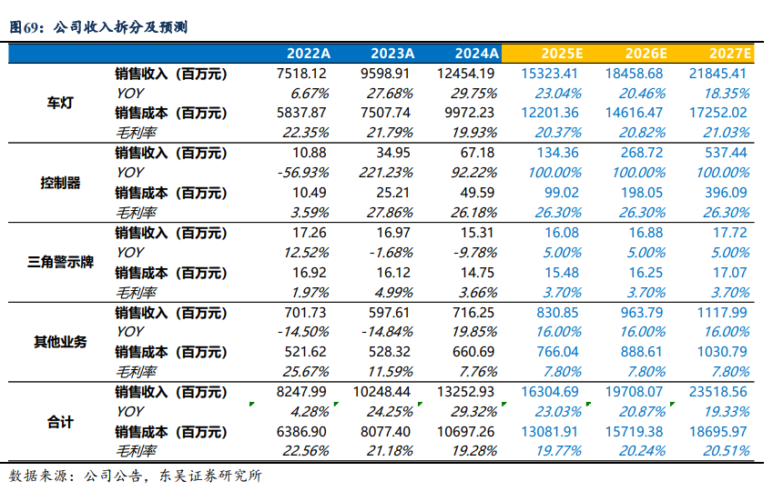 毛利率预测:预计随着车灯产品持续升级,公司产品结构优化叠加公司持续推进降本增效措施,公司车灯业务毛利率水平将稳中有升,2025-2027年分别为20.37%、20.82%、21.03%。整体来看,我们预计公司2025-2027年毛利率分别为19.77%、20.24%、20.51%。