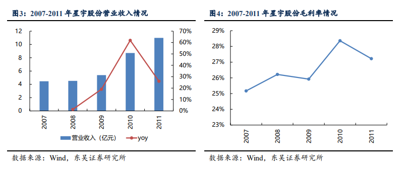 2007-2011年公司营收保持稳定增长。公司营收规模从2007年的4.46亿元持续增长至2011年的10.98亿元,复合增长率为25%。