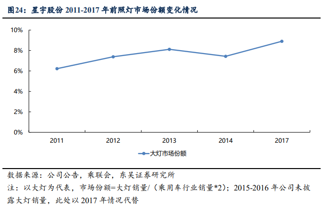 SUV周期前半段,星宇实现了市场份额的稳步小幅提升。以前照灯为代表,星宇的市场份额从2011年的6.22%持续提升至2017年的8.91%。