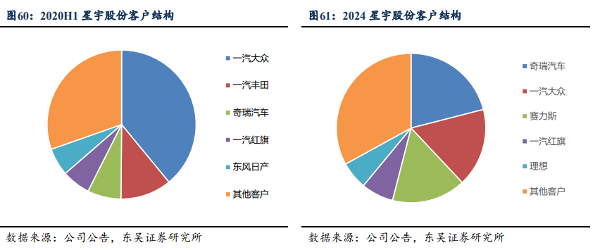 目前公司深度配套华为智选、奇瑞、理想、蔚来、吉利、北美电动车企等新能源/新势力头部客户,绑定头部客户使得公司后续持续受益于乘用车行业格局向头部集中。