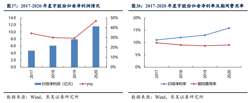 2017-2020年公司归母净利润向上突破10亿元规模。星宇的归母净利润规模在2017-2020年期间实现了高速增长,从2016年的3.50亿元快速增长至2020年的11.60亿元,4年复合增速为34.93%,归母净利润增速明显超越收入增速。