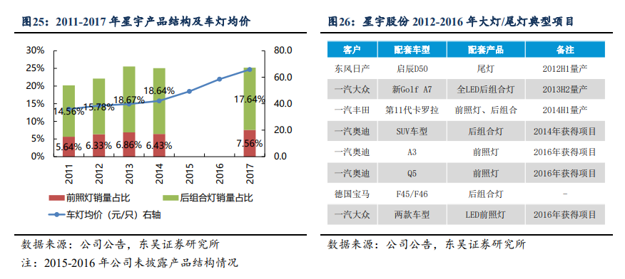 原有客户深化合作:公司与重点客户一汽大众和一汽丰田持续深化合作,配套项目也从小灯向大灯/尾灯扩展。公司对一汽大众和一汽丰田的营收从2011年的3.15亿元和1.10亿元大幅增长至2017年的12.86亿元和5.80亿元。