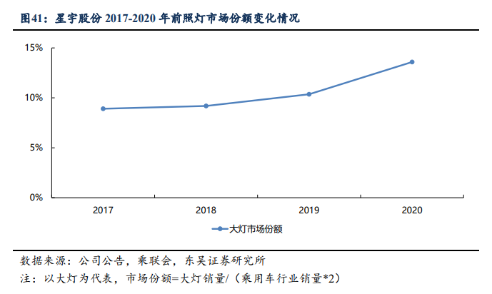SUV周期后半段(2017-2020年),星宇大灯市占率加速提升。以前照灯为代表,星宇的市场份额从2017年的8.91%快速提升至2020年的13.59%。