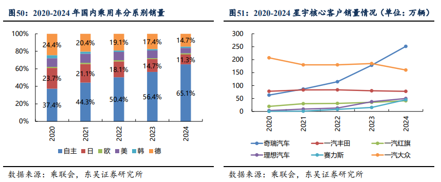 传统合资客户销量下滑,奇瑞、理想等自主客户持续成长。公司此前第一大客户一汽大众销量从2020年的207.15万辆下滑至2024年的160.09万辆;一汽丰田销量基本保持稳定。自主品牌客户方面,奇瑞销量从2020年的63.27万辆大幅增长至2024年的251.52万辆;理想销量从2020年的3.26万辆增长至2024年的50.05万辆。