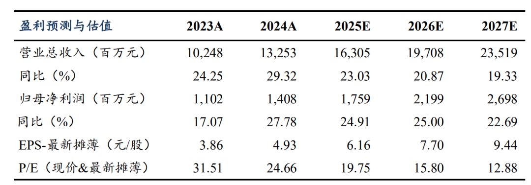 我们基本维持公司2025-2027年归母净利润分别为17.59亿元、21.99亿元、26.98亿元的预测,对应的EPS分别为6.16元、7.70元、9.44元,2025-2027年市盈率分别为19.75倍、15.80倍、12.88倍,维持“买入”评级。