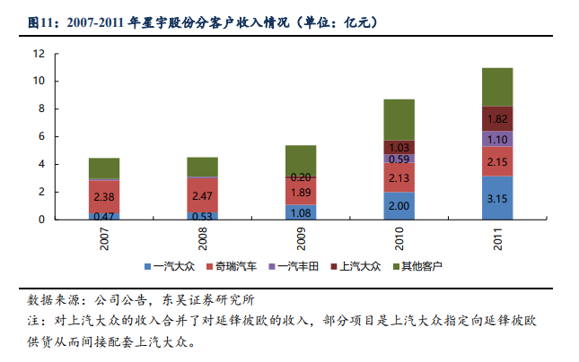 从分客户情况来看可以发现,这一阶段星宇的成长主要来自于德系和日系客户的驱动。一汽大众:收入从2007年的0.47亿元提升至2011年的3.15亿元,收入占比从10.5%提升至28.7%;上汽大众:收入从2009年的0.20亿元提升至2011年的1.82亿元,收入占比从3.7%提升至16.6%;一汽丰田:收入从2007年的0.10亿元提升至2011年的1.10亿元,收入占比从2.2%提升至10.0%。奇瑞汽车:收入从2007年的2.38亿元微降至2011年的2.15亿元,收入占比从53.4%下降至19.6%;