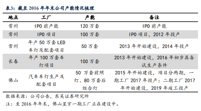 公司上市后至2016年保持稳定扩张,年资本开支金额维持2亿元上下。星宇自上市后开启了稳步扩张,2012-2016年资本开支水平基本维持在2亿元/年。除IPO募投项目外,公司还利用超募资金建设了常州“年产50万套LED车灯及配套项目”、长春“年产100万套车灯项目”以及“汽车车灯生产及配套项目”(佛山),进一步完善了对主要配套客户的产能布局。