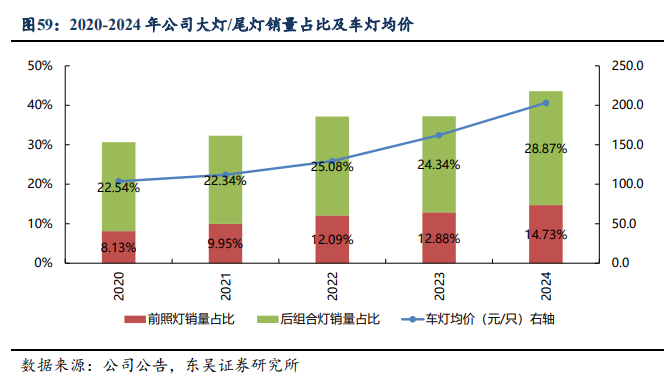 产品结构持续优化,星宇大灯/尾灯销量占比持续提升。公司大灯销量占比从2020年的8.13%提升至2024年的14.73%,尾灯销量占比从2020年的22.54%提升至2024年的28.87%,大灯+尾灯合计销量占比2024年达到43.59%。