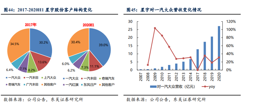 一汽红旗销量增长迅速,进入星宇前五大客户。得益于一汽红旗销量的快速增长,一汽红旗2020H1位列星宇第四大客户,收入占比为6.2%。