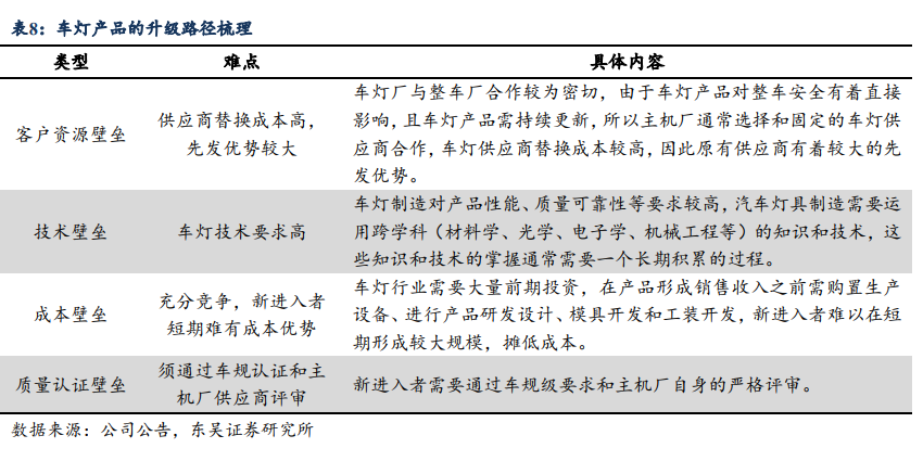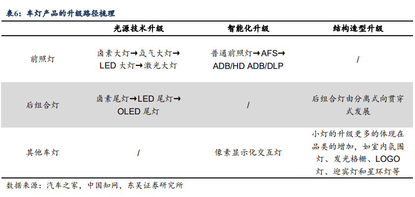 汽车车灯具备持续迭代升级的能力。车灯作为汽车的关键零部件,决定了车辆的造型美观以及使用安全性,其发展历史几乎与汽车本身的发展历史同步。汽车车辆本身的持续升级对车灯也提出了相应的产品升级要求,随着光源技术的发展、车辆安全性要求的提升、整车智能化水平的提升以及车辆造型设计的发展,车灯产品在各个维度都在持续升级。