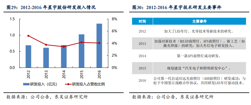 加大车灯新技术的研发:公司对LED前照灯、AFS前照灯、ADB前照灯等新技术持续投入研发,研发投入占营收比例2015-2016年持续保持在4%以上,且在2015年开始规划建设“汽车电子和照明研发中心”。