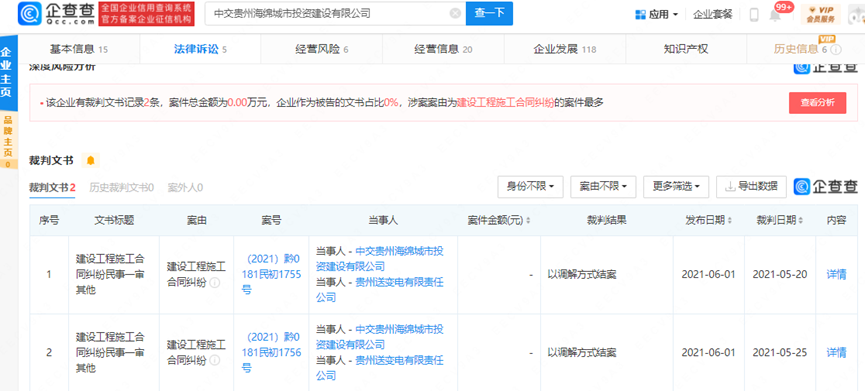 另外,中交贵州海绵曾两次涉及建设工程施工合同纠纷,案号分别为(2021)黔0181民初1755号、(2021)黔0181民初1756号,开庭时间均在2021年5月,两次纠纷中,中交贵州海绵均为被告,原告均为贵州送变电有限责任公司,最终均以调解方式结案。