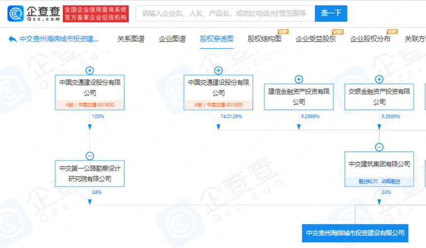 资料显示,中国交建通过子公司中交第一公路勘察设计研究院有限公司,以及控股子公司中交建筑集团有限公司分别持有中交贵州海绵24%的股权,中交贵州海绵为中国交建联营企业。中交贵州海绵成立于2017年4月,注册资本为4.35亿元人民币,公司地址位于贵州省贵安新区行政中心11号楼,所属行业为商务服务业。