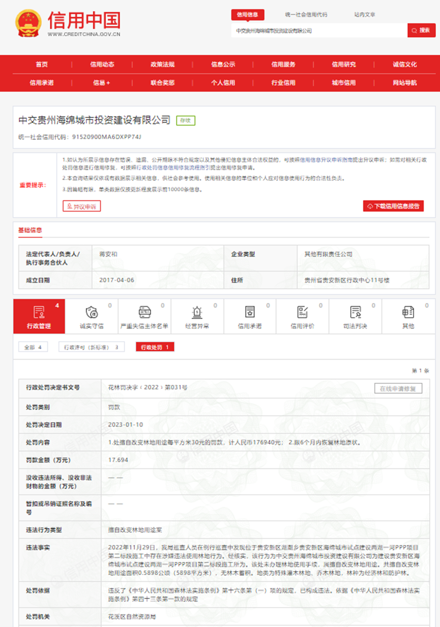 据信用中国,近日,因擅自改变林地用途,中国交建(601800.SH)联营企业中交贵州海绵城市投资建设有限公司(以下简称“中交贵州海绵”)遭到处罚。