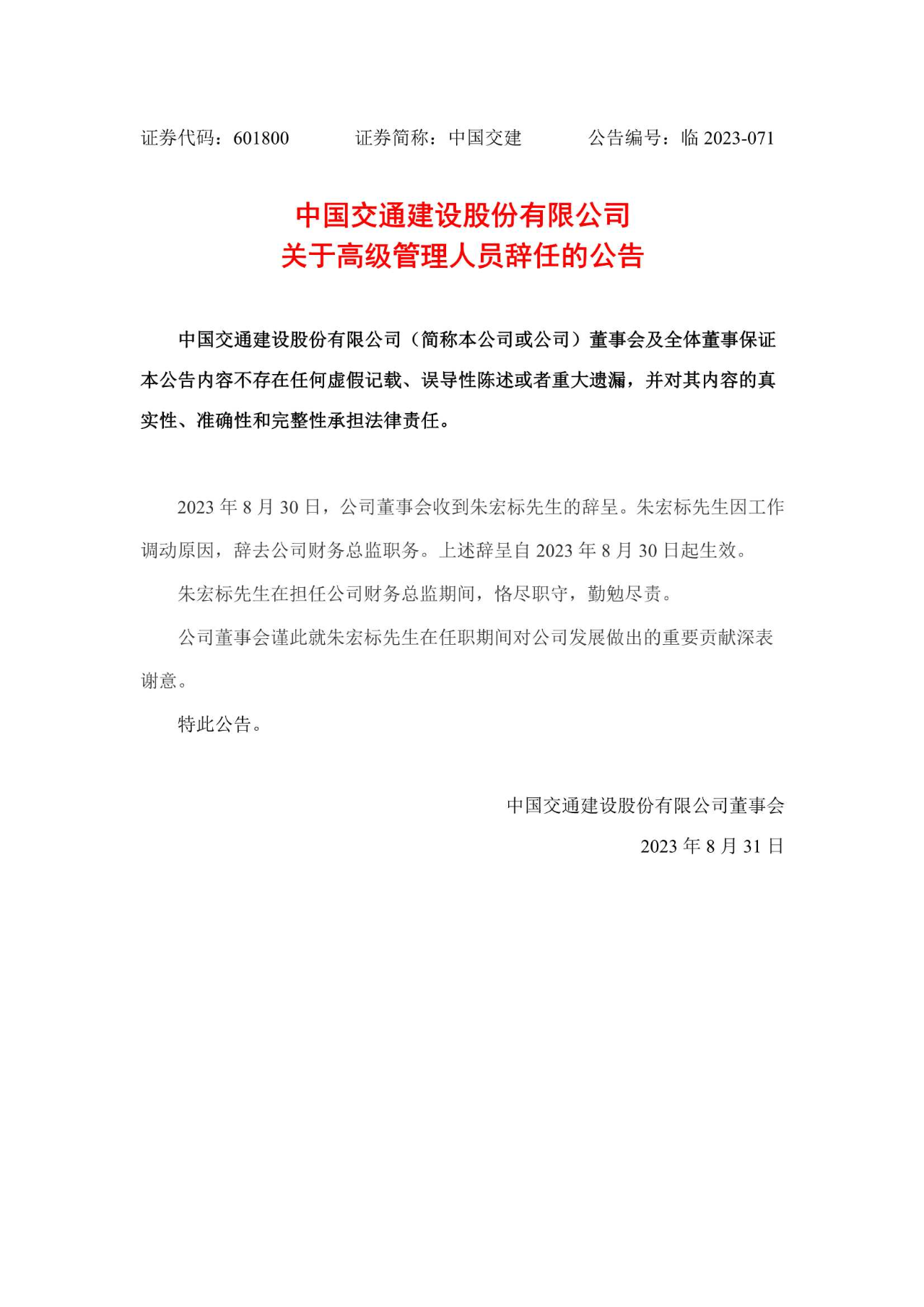 中国交通建设股份有限公司关于高级管理人员辞任的公告