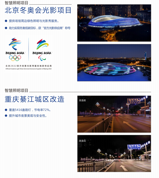 其典型案例如中国交建智慧照明项目是“2022北京冬奥官方创意光影服务独家供应商”,并投入参与至“重庆綦江城区改造”“一带一路峰会北京雁西湖景区”“2008奥运会鸟巢”等多个项目,还在甘肃平凉市、江苏徐州市、河南新乡市、宁夏回族自治区石嘴山市等多地运用,改造当地城市道路照明。