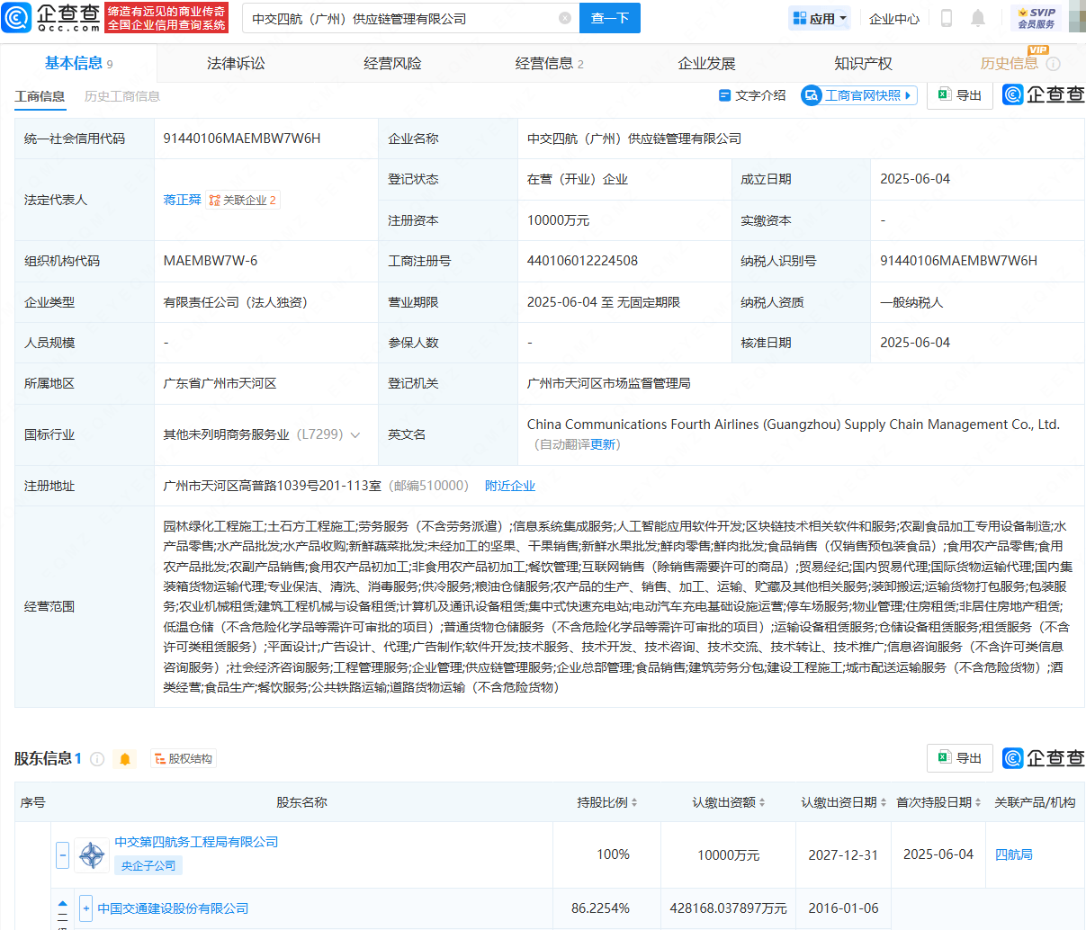 近日,中交四航(广州)供应链管理有限公司成立,法定代表人为蒋正舜,注册资本为1亿元,经营范围包含:园林绿化工程施工;人工智能应用软件开发;区块链技术相关软件和服务;贸易经纪;国内贸易代理;国际货物运输代理等。股权穿透显示,该公司由中国交建(601800)旗下中交第四航务工程局有限公司全资持股。
