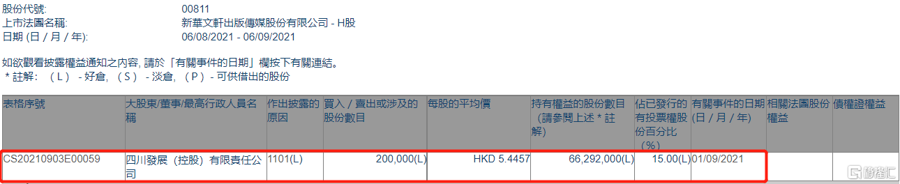 根据联交所最新权益披露资料显示,2021年9月1日,新华文轩(00811.HK)获四川发展(控股)有限责任公司在场内以每股均价5.4457港元增持20万股,涉资约108.91万港元。