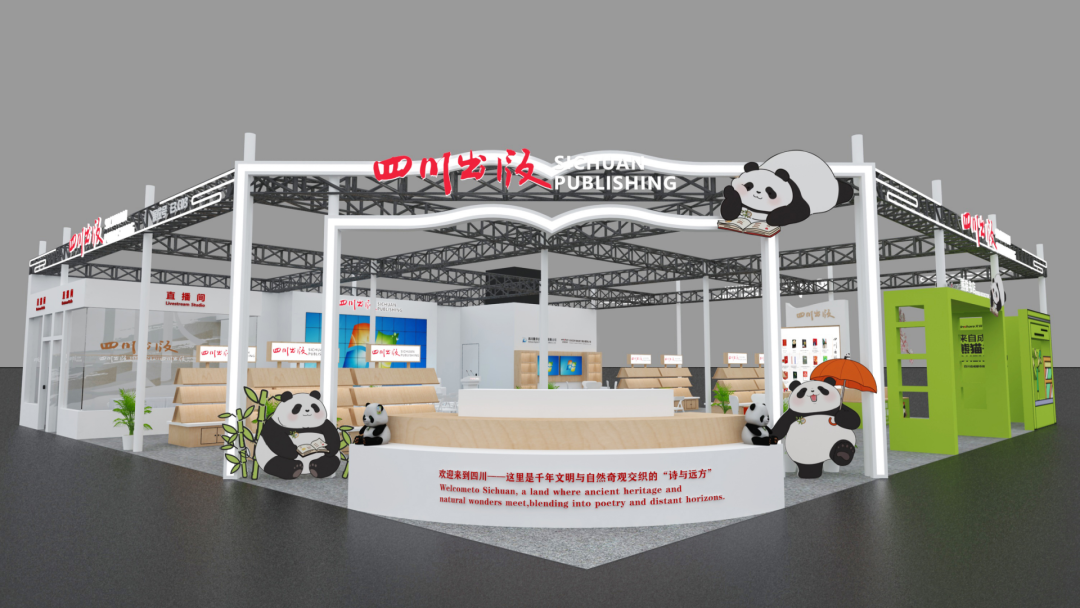 憨态可掬的“大熊猫”是展馆的核心视觉符号,以“书香天府熊猫伴读”为设计理念,展示巴蜀文化的独特魅力,构建起兼具简约格调、现代风范与国际视野的沉浸式展陈空间。馆内四川出版精品书台陈列的一本本装帧精美的书籍,“欢迎来四川——这里是千年文明与自然奇观交织的‘诗与远方’”的中英文对照宣传语熠熠生辉,彰显着四川出版以图书为媒介,让天府文脉跨越山海,在全球续写中国故事。