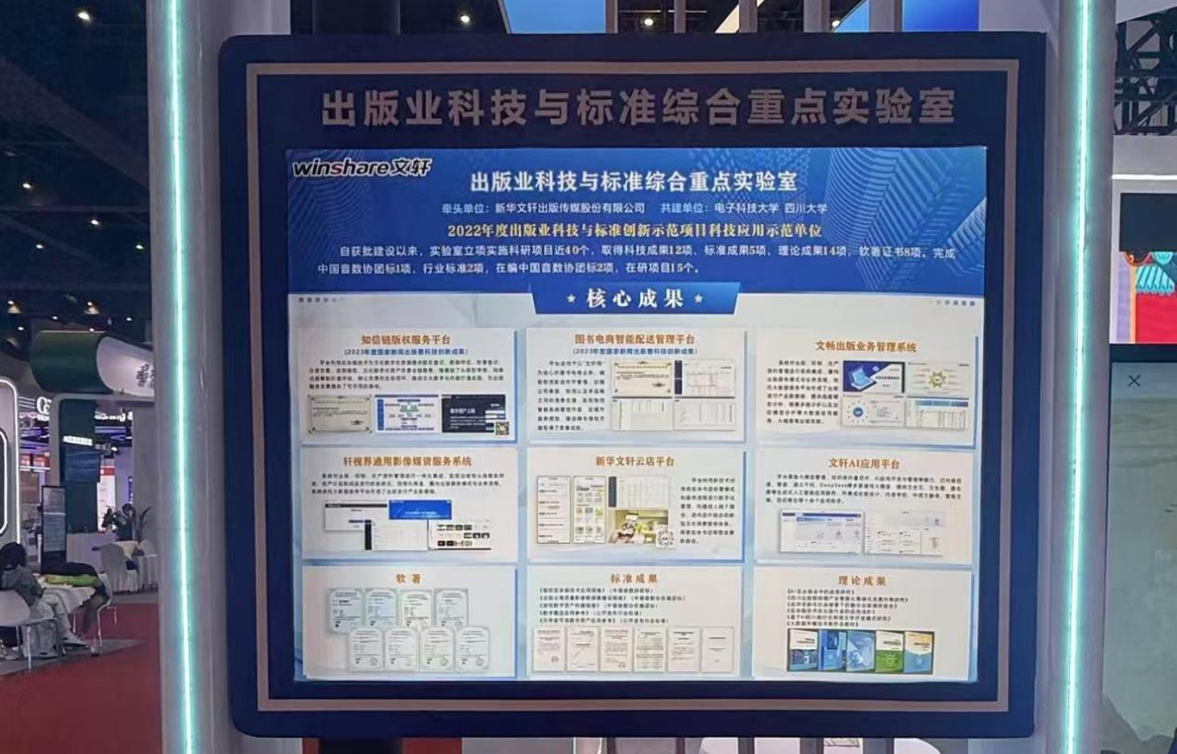 出版业科技与标准综合重点实验室则聚焦行业技术创新与标准化建设,集中展示了其获批建设以来取得的包括31项科研项目、12项科技成果与8项软著证书在内的多项科研成就,体现了新华文轩在驱动行业标准化与技术创新方面的硬实力。