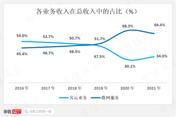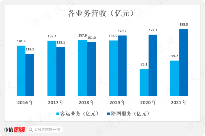 2020年客运业务的收入较上年减少了51.4%。虽说路网服务在2020年的收入增速也下降了超过10个百分点,但是还没到负增长的水平。