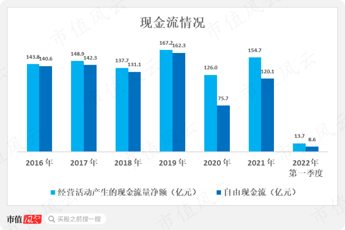 公司的经营活动现金流量净额在最近一个年度表现非常好,154.7亿元已经快接近疫情前的最好水平;自由现金流达到120亿,同比增长了58.6%。
