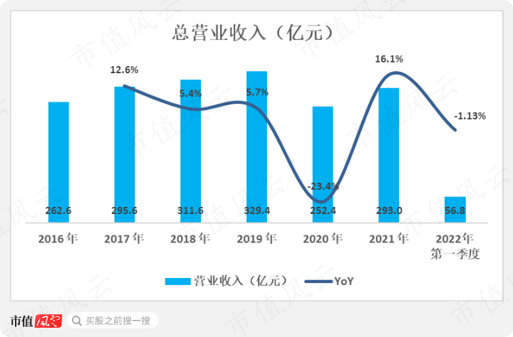 公司的总营业收入在2020年因为疫情而大幅下跌,同比减少超过23%,2021年增速回弹,规模接近300亿,但是距离疫情前水平依旧有距离。