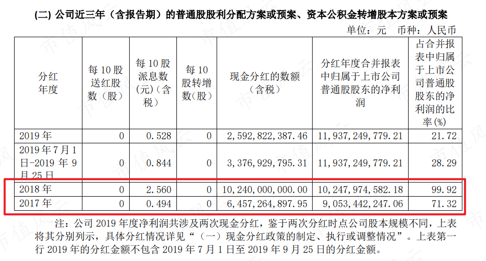 而在上市前的2017、2018年,公司曾有两次豪爽分红,分别约为64.6亿与102.4亿,占当年归母净利润的71.3%与99.9%。
