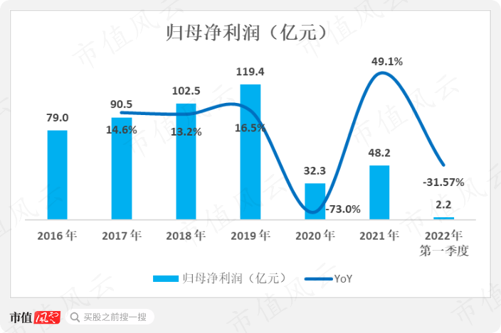 到了2021年增速好不容易反弹了一波,结果今年的上海疫情又把数据给干下去了,一季度的归母净利润仅2.2亿,同比减少约32%。