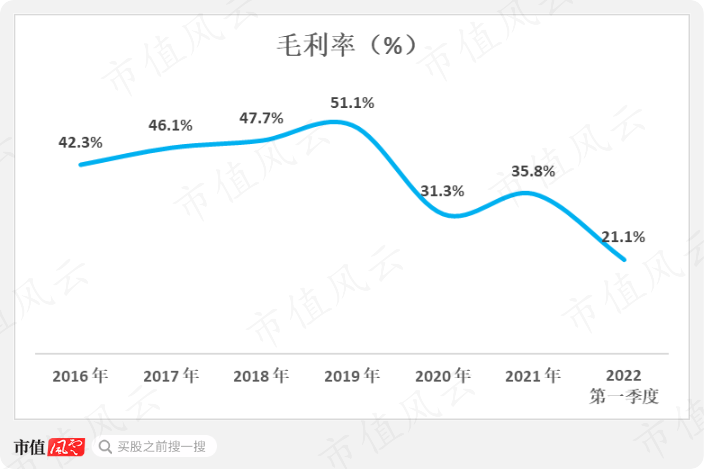 这下相信各位已经把公司成本中占比最大的几个部分都搞明白了,接下来咱们来看看毛利率。可以看到数据在2020年有了十分明显的下降,到了今年一季度,已经下降到21.1%。