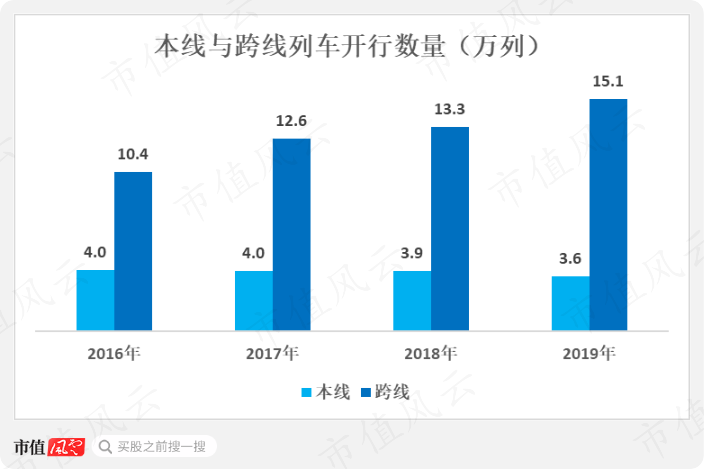 2016年到2019年,公司列车开行数量上的增量几乎全部来自于跨线列车,本线列车开行数量在这四年里面呈现减少的趋势。