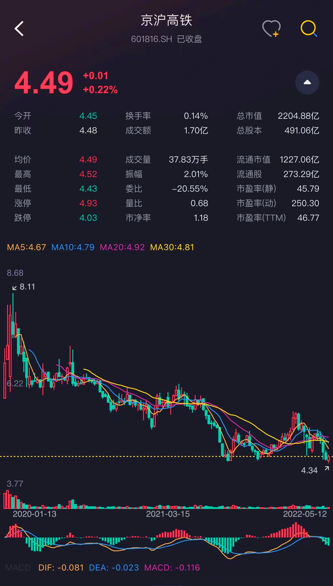 目前京沪高铁总市值超过2000亿,吾股排名410位。