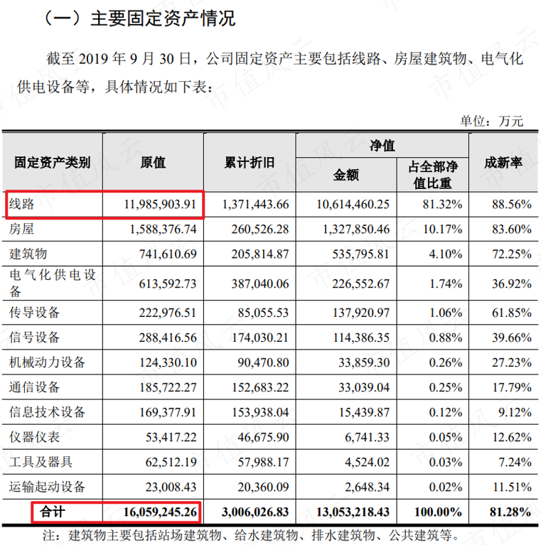 占固定资产最多的是“线路”,也就是和铁路相关的资产,例如路基、道口、防护林等。
