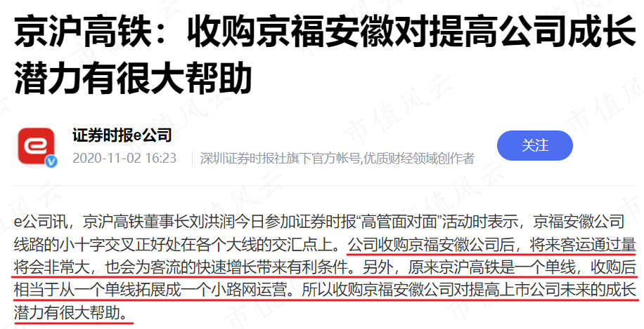 京沪高铁董事长刘洪润就在公开场合表示过,此次收购将公司从曾经的单条线路运行模式变成了小路网运营模式,提升了公司的成长潜力。