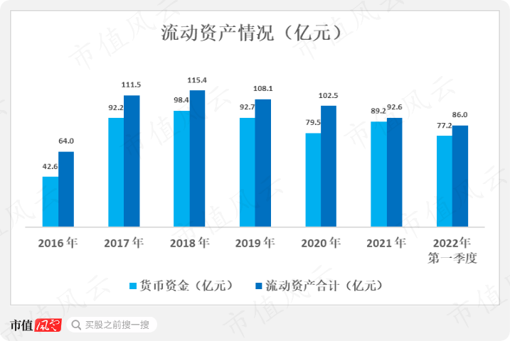 公司目前账面上的货币资金为77.2亿,是流动资产的主要组成部分,占比约90%。