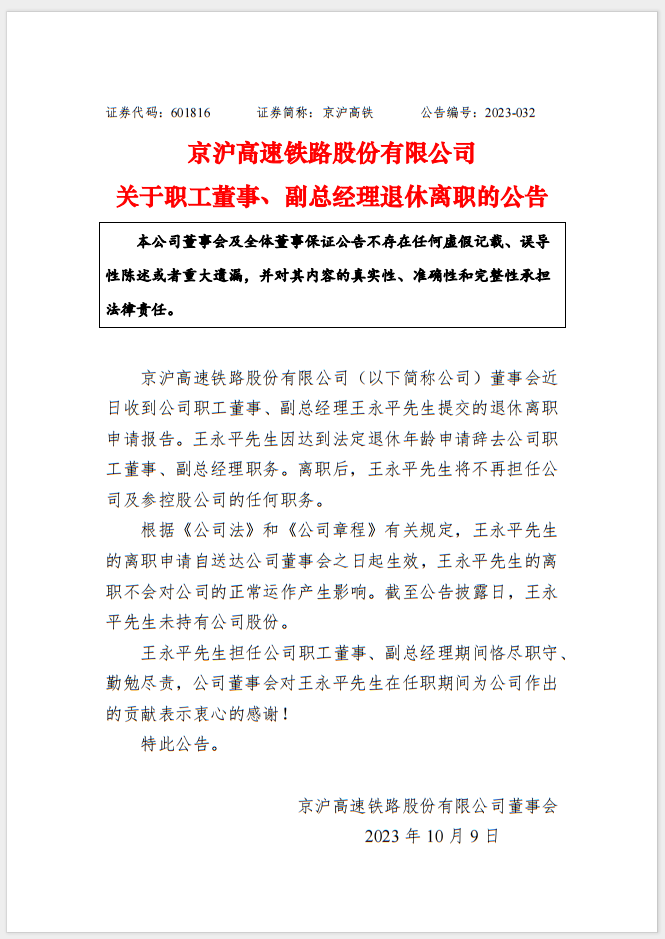 京沪高铁公司关于职工董事、副总经理退休离职的公告