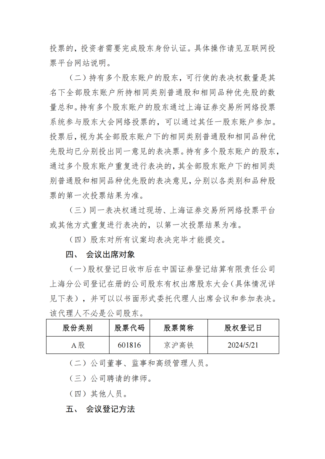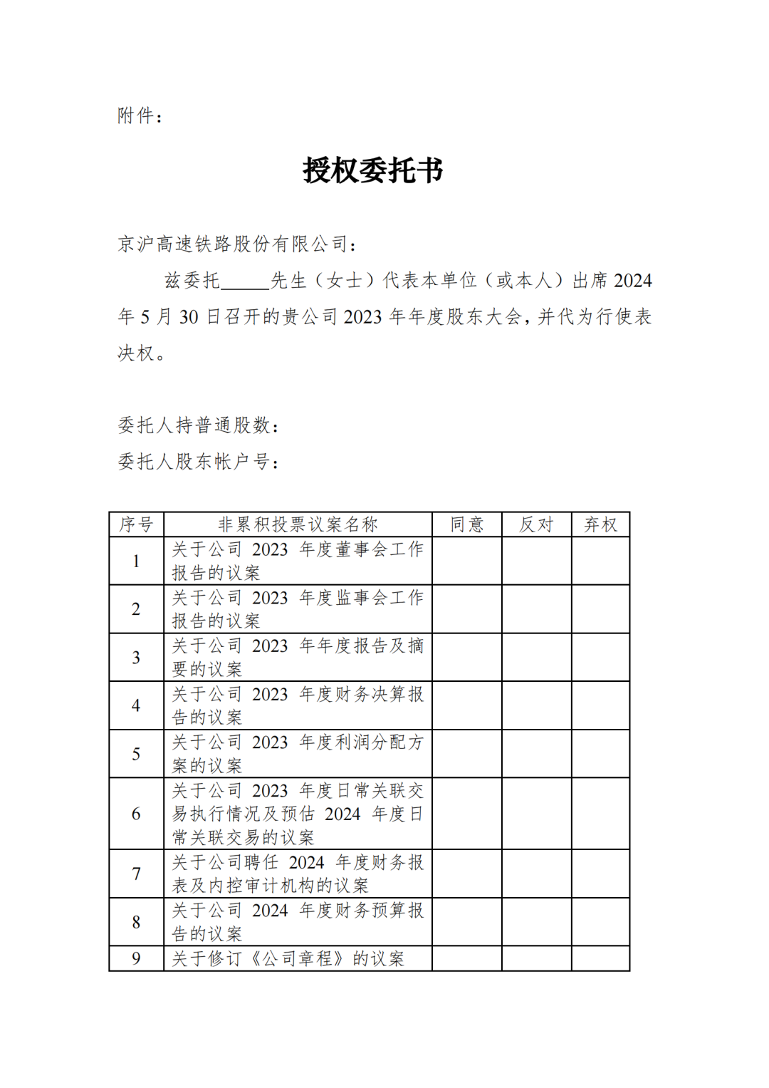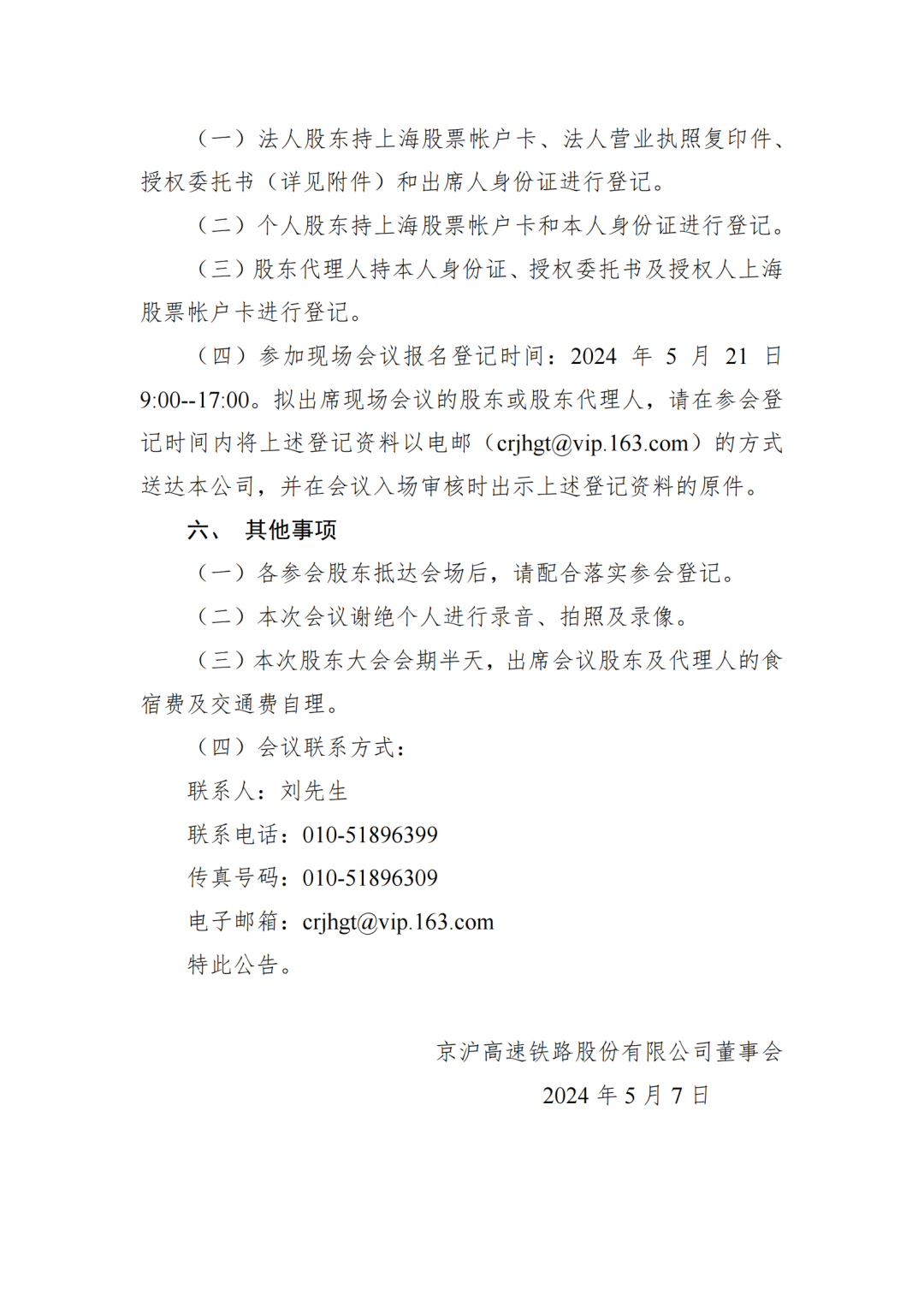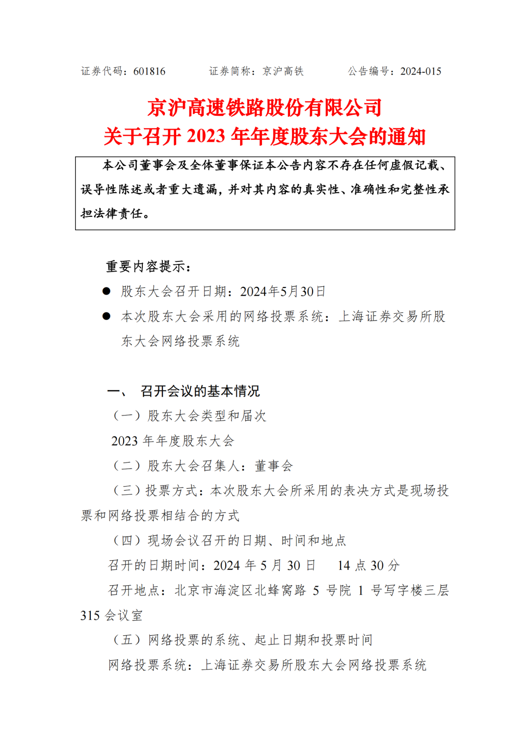 京沪高铁公司关于召开2023年年度股东大会的通知